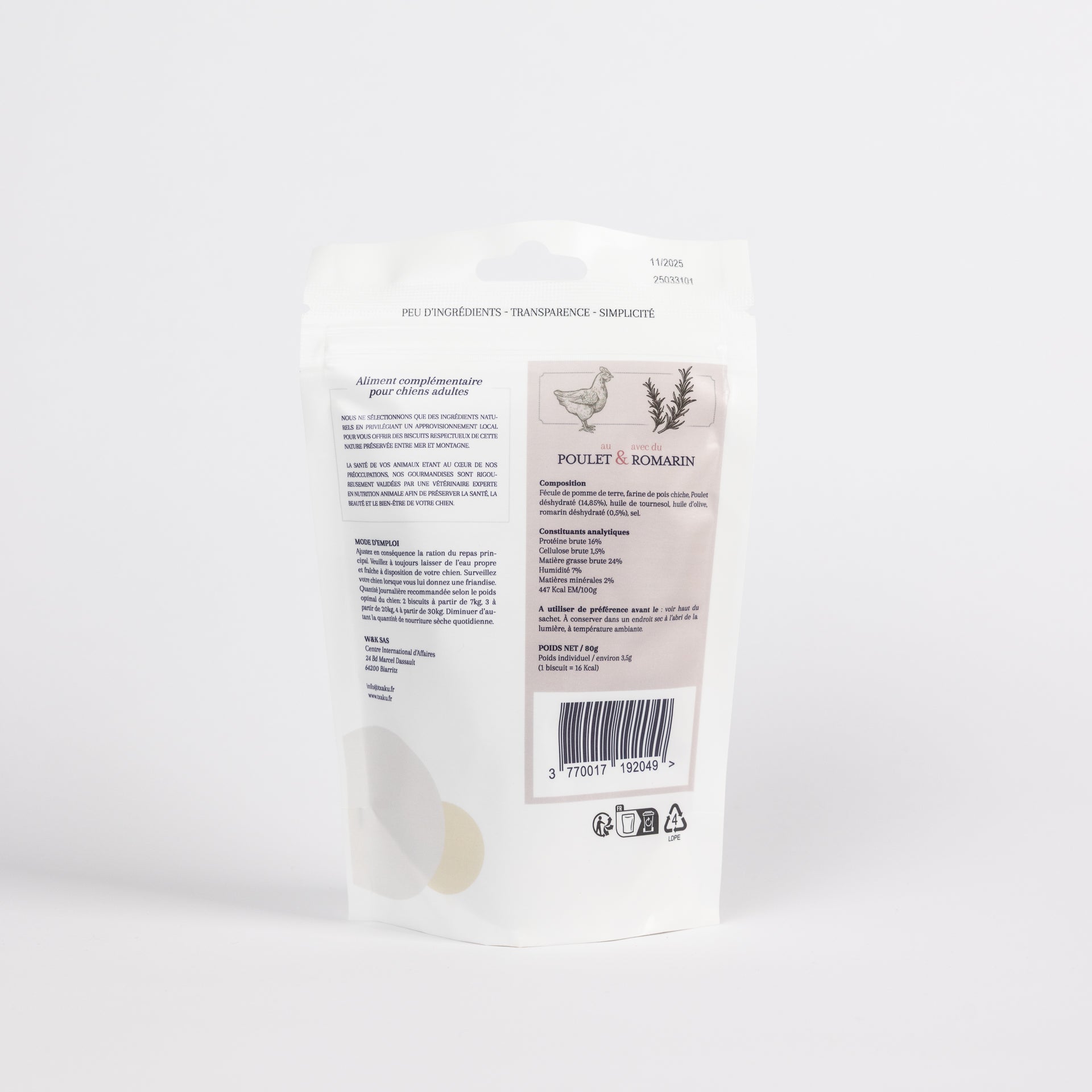 Notre recette poulet romarin est l'idéal pour plonger dans notre univers de friandises naturelles et haut de gamme pour les chiens. Pour l'éducation, les promenades ou les moments gourmands, ces biscuits ne manqueront pas de ravir les sens de nos fidèles compagnons. Et le meilleur ? Nos biscuits sont si bons que vous pouvez même les goûter vous-même !